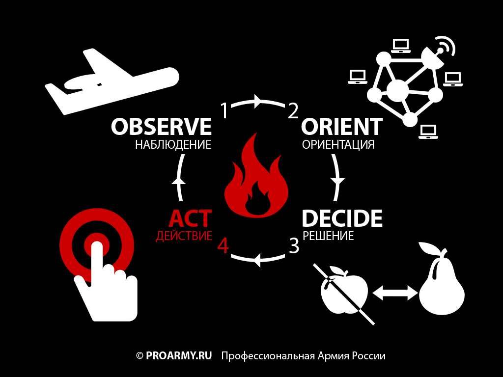 Фактически на принципе «Петли Бойда» построено деление сетецентрической стратегии на четыре смежных области человеческой структуры, по аналогии: