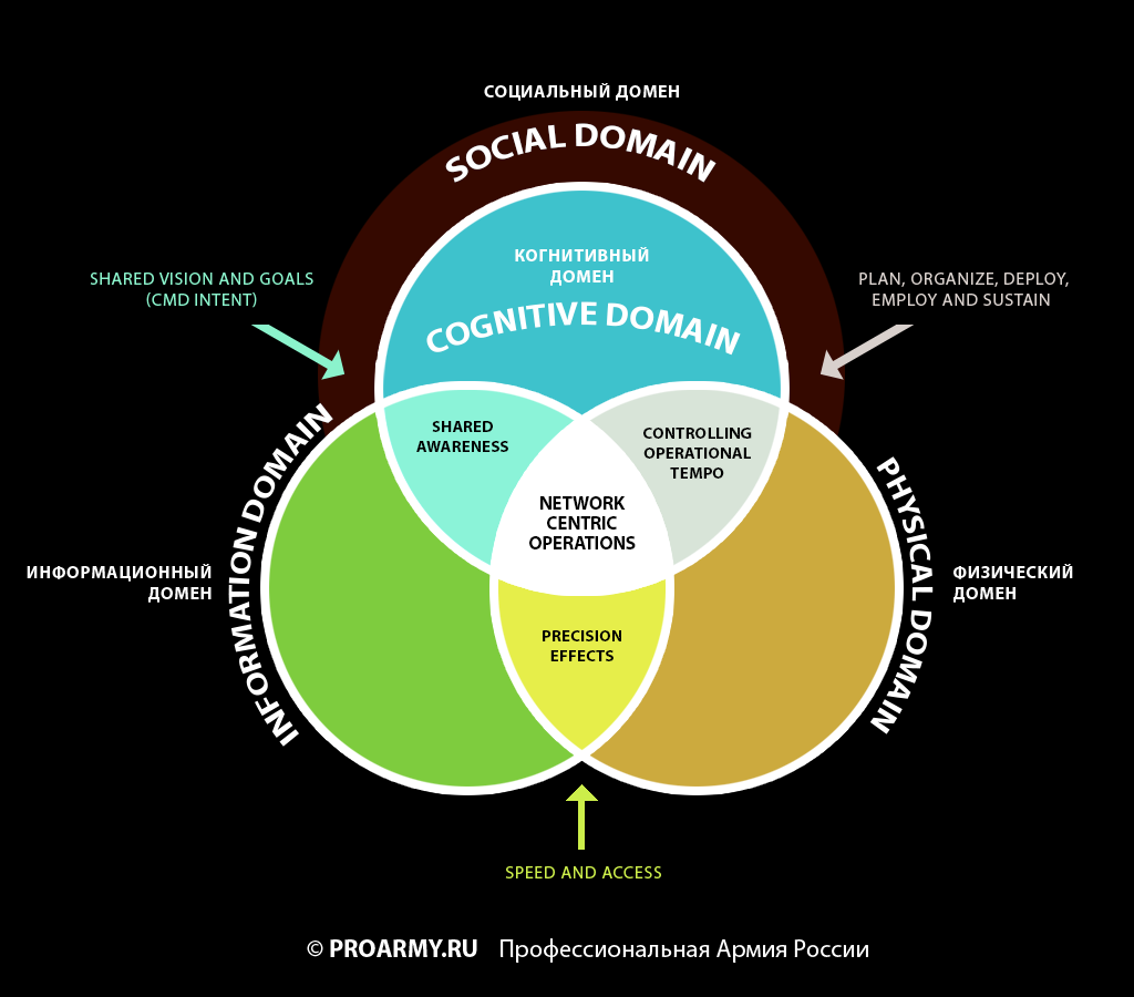 Войны информационной эпохи основаны на сознательной интеграции всех четырех вышеназванных областей. Из них и создается сеть, которая лежит в основе ведения военных действий. Настройка всех факторов сети в гармоничном сочетании усиливает синергетический военный эффект действия Вооруженных Сил, а сознательная дисгармонизация подобных областей противника, напротив, расстраивает его ряды, разводит эти области между собой, лишая противника важнейшего фактора превосходства. Для дисгармонизации социальной области противника и, находящейся в ней, когнитивной области проводятся стратегические и тактические Информационно-Психологические Операции (ИПО). Сектор взаимопересечения этих четырех областей имеет принципиальное значение. То, насколько «стартовые условия войны» важны для военно-политической элиты США указывает тот факт, что разработка и изучение Операций Базовых Эффектов - «EBO» (Effects Based Operations) выделено ими в отдельную дисциплину теории сете-центрических войн.